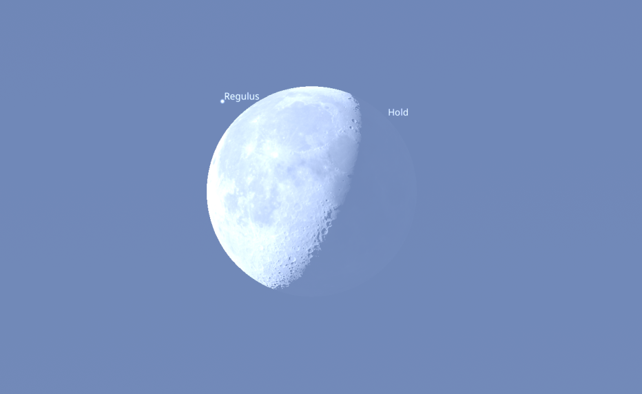 Reggel 6:00-kor tehát a 67%-os fázisú Hold az Oroszlán csillagkép 1,4 magnitúdós látszó fényességű csillaga, a Regulus mellé ér, mégpedig attól 1,3 fokos távolságba. Mindez a délnyugati látóhatár felett 50 fokos magasságban történik majd meg, így a megfigyeléshez nem feltétlenül muszáj kimenni a szabad ég alá, ha van délnyugati irányba néző ablakunk. A jelenség magassága, illetve az együttállásban részt vevő égitestek fényessége miatt ugyanis nem szükséges sem jól látható horizont, sem különösebben jó minőségű égbolt, avagy távcső.