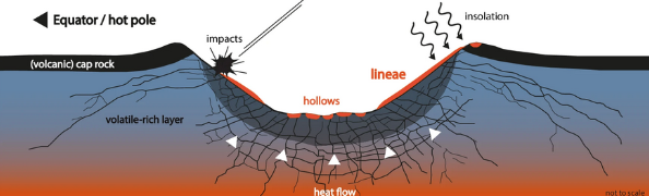 „Lehet, hogy pontosan ugyanarról az illékony anyagról és folyamatról van szó, de míg az üregek sík területeken jelennek meg, vonalak akkor jönnek létre, ha a folyamat lejtőn zajlik.” – mondja Bickel.